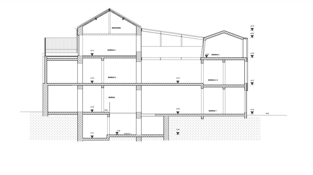 Le bâti existant était formé de plusieurs bâtiments et extensions de différentes périodes. Il n’y avait pas de cour, les constructions couvrant entièrement le terrain. Les trois niveaux abritaient des bureaux. Le collage des matériaux et formes existants peinait à s’affirmer dans le tissu environnant. L’objectif principal a donc été d’améliorer l’esthétique de l’ensemble, de diviser les espaces en lots plus attractifs, surtout en apportant plus de lumière naturelle aux espaces d’origine très sombres et fermés.