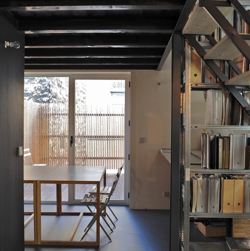 Par l’agrandissement des fenêtres existantes, les espaces intérieurs, malgré leur grande profondeur, vont être mis en contact avec les espaces extérieurs. Les bureaux du 2ème étage profitent d’une terrasse et d’une loggia accessibles. Cet aménagement permet de mettre les espaces en relation avec le jardin du terrain voisin côté nord, et avec la rue côté sud.