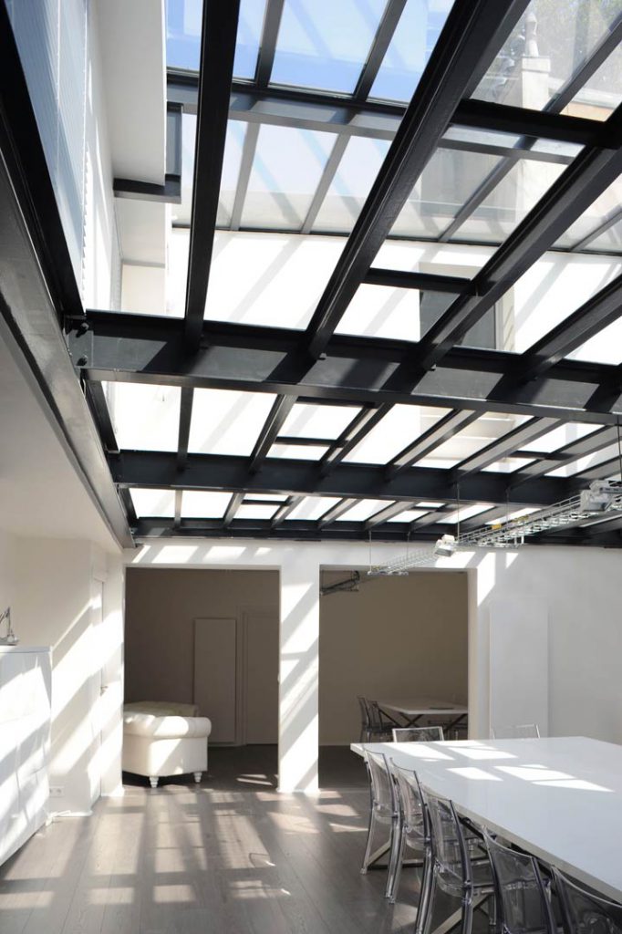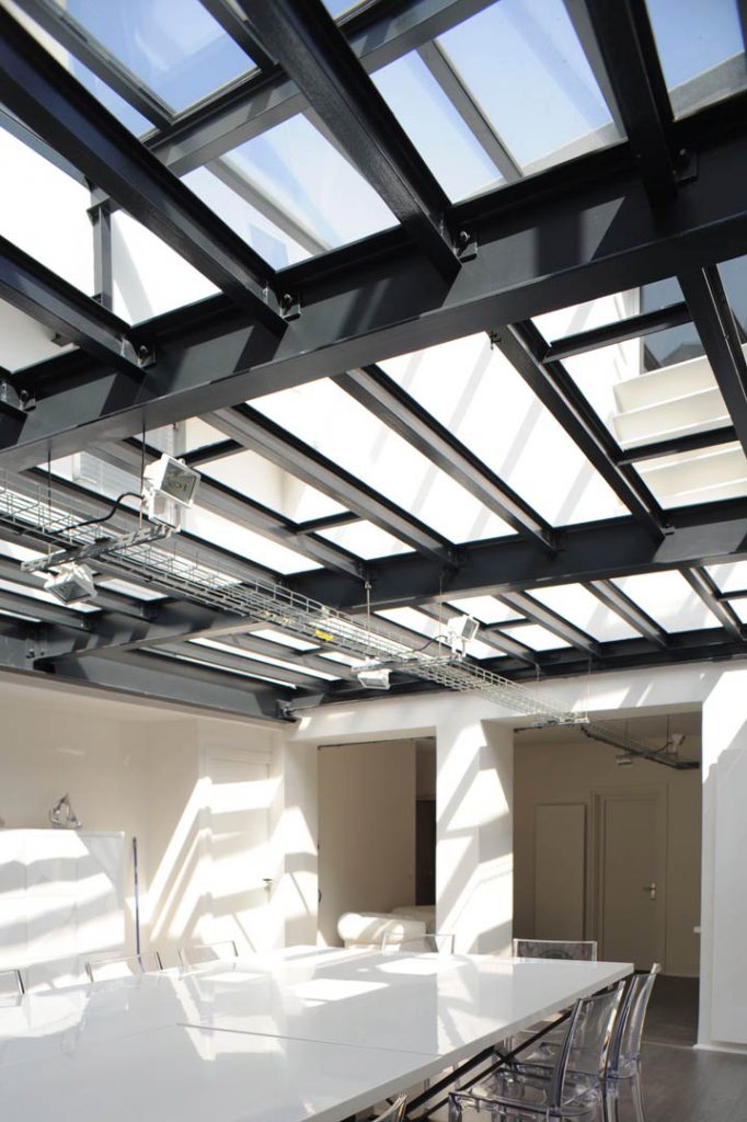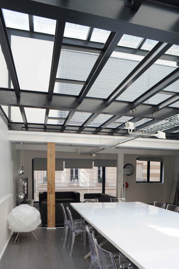 Les bureaux des 1er et 2ème étages sont groupés autour d’une verrière s’élevant sur deux étages suite à la suppression d’un plancher intermédiaire rapporté. La structure en acier a été laissé à sa place afin de conserver la stabilité de l’ensemble. Cet espace constitue un élément architectural fort, distribuant une lumière généreuse au premier étage, utilisé comme cour commune pour les fêtes des locataires. Le 1 er étage profite donc d’ une grand luminosité zénithale, renforcée par une deuxième verrière, créée au fond du lot.