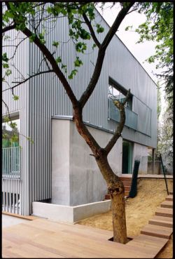 Une maison étroite arrive à se glisser de justesse dans la partie nord du terrain au milieu d’un îlot laissant ainsi place à 3 terrasses ensoleillées et une piscine acollée au bâtiment. Le corps principal de ce dernier est rythmé par des volumes en avancée et en retrait. Leur dimension et leur position est le résultat d‘un travail de composition destiné à satisfaire les impératifs des réglementations urbanistiques et des besoins fonctionnels et architecturaux. Les espaces intérieurs sont fluides, lumineux et en permanence en contact visuel et physique avec le jardin. La continuité des circulations et les vues longues donnent un sentiment d’espace généreux malgré les dimensions réelles relativement petites. Au rez-de-chaussée se situent les espaces à vivre avec la chambre des parents et un hall d’entrée à double hauteur. Les quatre enfants ont leurs chambres au 1er étage avec une petite salle de TV. Au sous-sol se situent un bureau et une salle de home-cinema. Les 3 niveaux sont liés par un bloc central où sont groupés l’escalier, la cuisine, la salle d‘eau du 1 er étage et le local technique. Ce bâtiment ainsi conçu respecte les principes d’une maison passive.