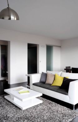 La rénovation concerne un appartement situé dans un immeuble des années 70. Le projet exploite les vues et la lumière traversante du 8 ème étage au travers de cloisonnements vitrés et autres finitions minimalistes. Un important travail a été réalisé pour permettre l’aménagement des pièces humides et de rangements dans l’étroite partie centrale de l’appartement, permettant ainsi la création d’une chambre supplémentaire au droit de l’ancienne cuisine. La nouvelle cuisine, placée dans la continuité de la salle à manger, dispose cependant d’une certaine autonomie. Elle peut en effet être fermée avec un panneau vitré coulissant.