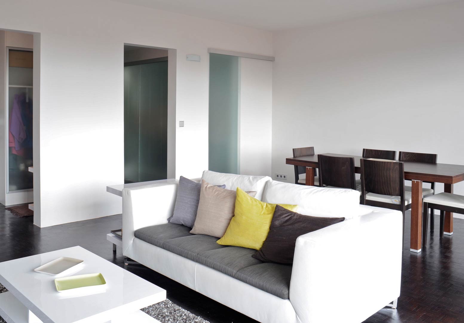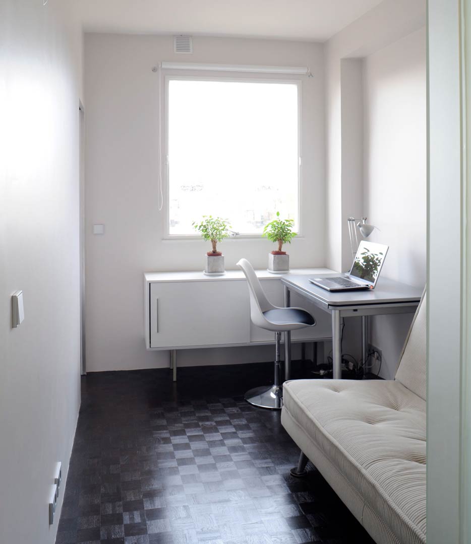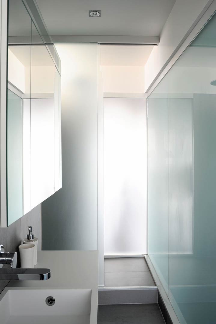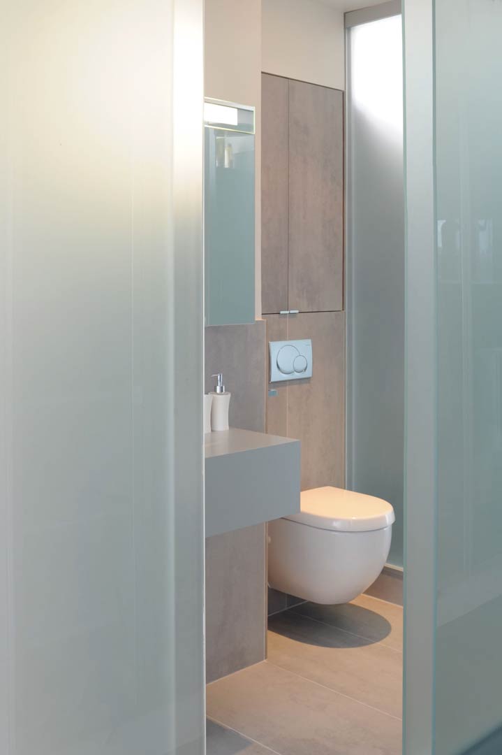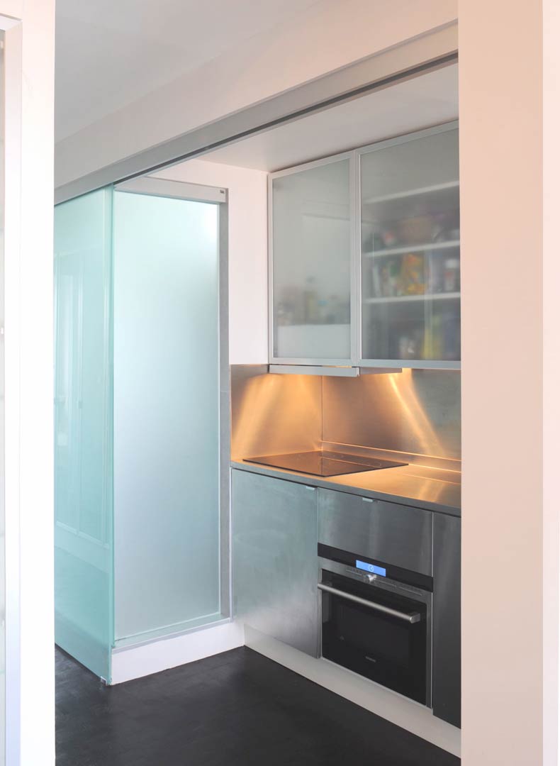 La rénovation concerne un appartement situé dans un immeuble des années 70. Le projet exploite les vues et la lumière traversante du 8 ème étage au travers de cloisonnements vitrés et autres finitions minimalistes. Un important travail a été réalisé pour permettre l’aménagement des pièces humides et de rangements dans l’étroite partie centrale de l’appartement, permettant ainsi la création d’une chambre supplémentaire au droit de l’ancienne cuisine. La nouvelle cuisine, placée dans la continuité de la salle à manger, dispose cependant d’une certaine autonomie. Elle peut en effet être fermée avec un panneau vitré coulissant.